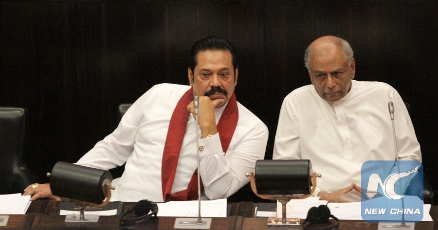 File Photo: Sri Lanka's new Prime Minister Mahinda Rajapaksa (L) attends a Parliament session in Colombo, Sri Lanka, on Nov. 14, 2018. (Xinhua/A.Hapuarachic)