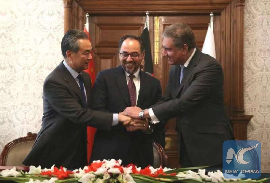 Chinese State Councilor and Foreign Minister Wang Yi, Afghan Foreign Minister Salahuddin Rabbani and Pakistani Foreign Minister Shah Mahmood Qureshi (L-R) shake hands after signing an agreement during the 2nd China-Afghanistan-Pakistan Foreign Ministers' Dialogue in Kabul,Afghanistan, on Dec. 15, 2018. (Xinhua/Rahmat Alizadah)