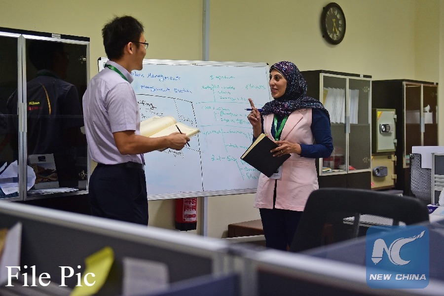 Amira Reda(R), in charge of the operational management of the Egypt TEDA Investment Company, talks with her Chinese colleague in the office at Egypt TEDA Investment Company in the China-Egypt Suez Economic and Trade Cooperation Zone (SETC Zone) in Ain Sukhna, Egypt on Oct. 16, 2016. (Xinhua File photo)