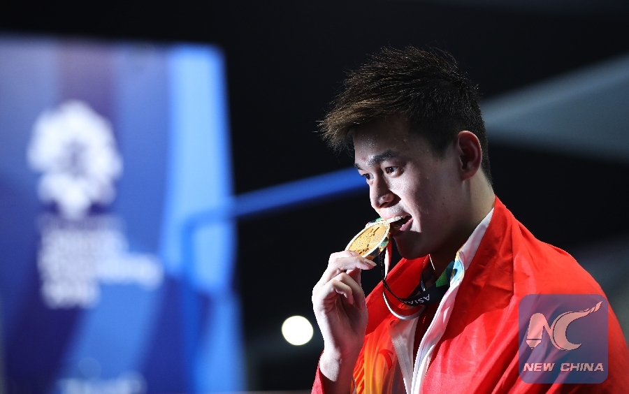 Sun Yang smells at a medal ceremony of Jakarta Asian Games on August 24, 2018. (Xinhua)