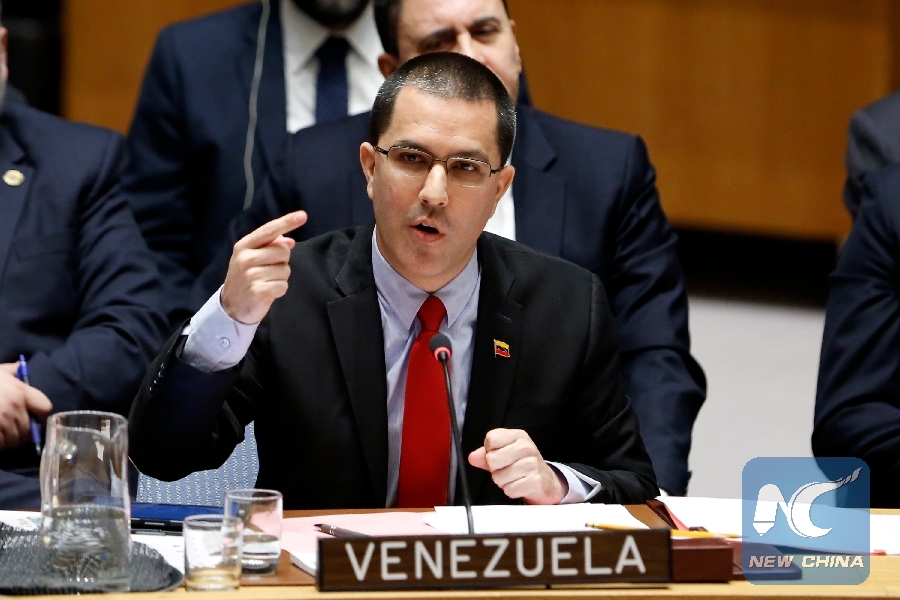 File Photo: Venezuelan Foreign Minister Jorge Arreaza addresses a United Nations Security Council emergency meeting on the situation in Venezuela, at the UN headquarters in New York, Jan. 26, 2019. (Xinhua/Li Muzi)