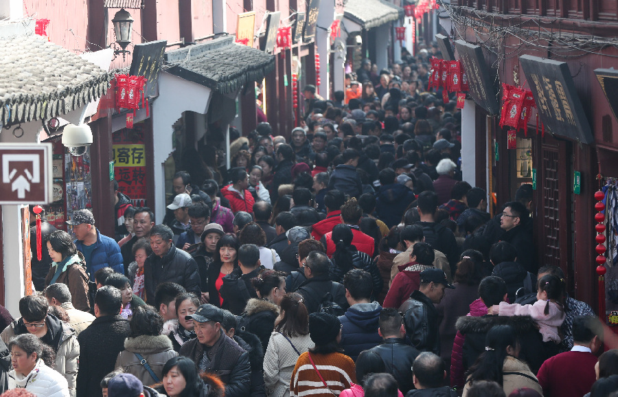Tourists visit Qibao ancient town in east China's Shanghai, Feb. 6, 2019, the second day of the Chinese Lunar New Year. (Xinhua/Ding Ting)