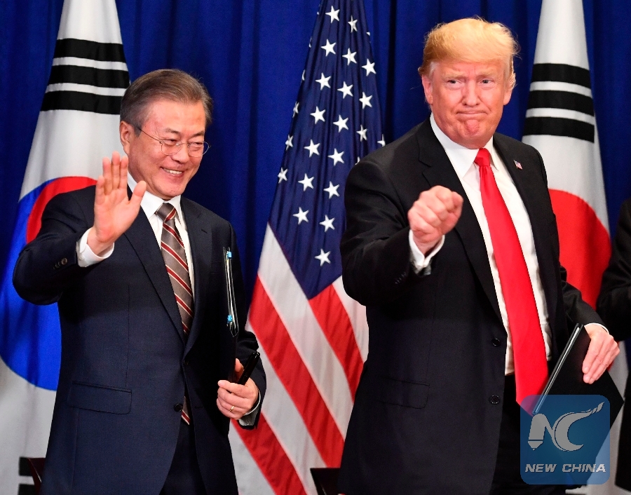 U.S. President Donald Trump (R) and South Korean President Moon Jae-in gesture after signing a trade agreement at a bilateral meeting in New York on Sept. 24, 2018, a day before the start of the General Debate of the 73rd session of the UN General Assembly. (AFP Photo)