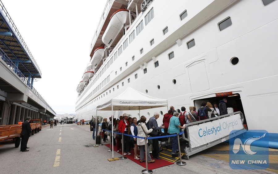 Tourists board a Celestyal Cruises ship in Piraeus, Greece's largest port, Greece, on April 21, 2017. (Xinhua/Ye Pingfan)