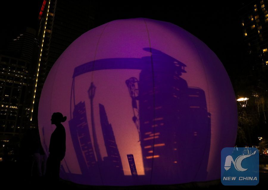 A woman takes a photograph with a "moonGARDEN" sphere with urban scenery shadows at Discovery Green park in downtown Houston, Texas, the United States, Oct. 6, 2018. (Xinhua/Yi-Chin Lee)
