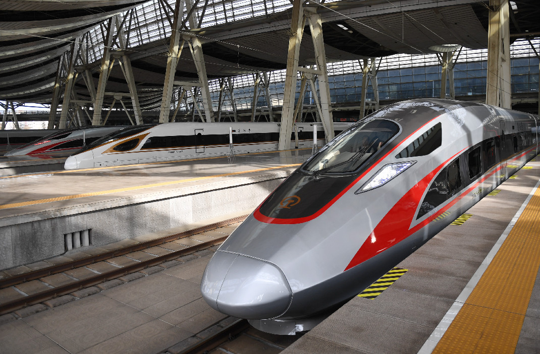 Photo taken on Jan. 5, 2019 shows a new Fuxing bullet train (R) at Beijing South Railway Station in Beijing, capital of China. (Xinhua)