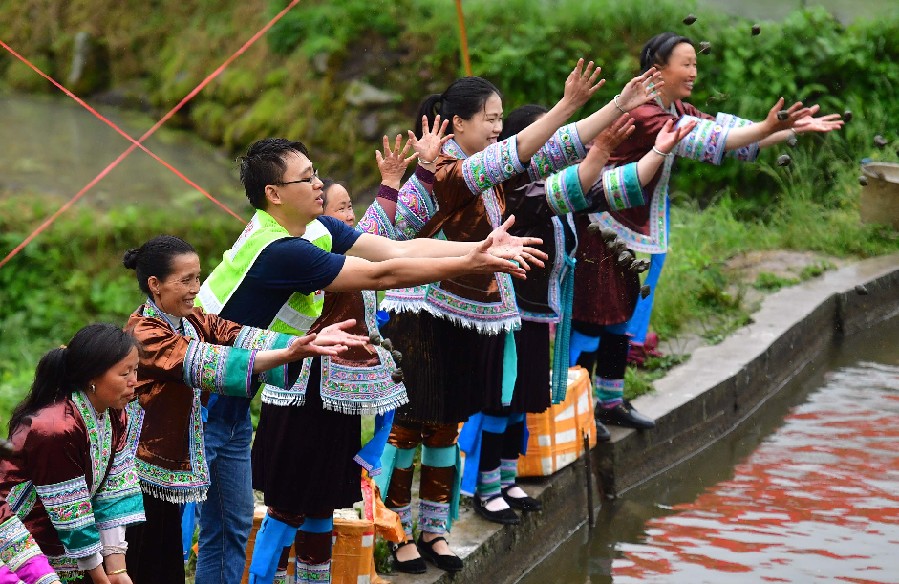 Pang Kai (3rd L), a poverty alleviation official who has been assigned as the Party chief to Gaopei Village, works with villagers in a pilot field, where they raise river snails along with rice seedlings, in Rongshui Miao Autonomous County of Liuzhou, south China's Guangxi Zhuang Autonomous Region, April 29, 2019. (Xinhua/Huang Xiaobang)
