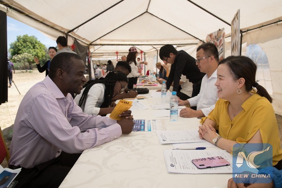 Representatives of Chinese enterprises talk with job seekers during a jobs expo held by the Confucius Institute at the University of Zambia in Lusaka, Zambia, Oct. 26, 2018. (Xinhua/Peng Lijun)