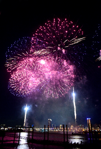 Fireworks explode over the Tamsui river during the 2019 Taipei Dadaocheng Fireworks Festival in Taipei, southeast China's Taiwan, on Aug. 3, 2019 . (Xinhua/Zhu Xiang)