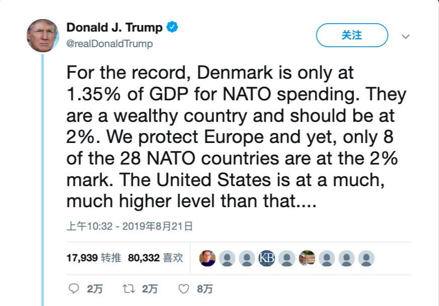 In a tweet Wednesday night, Trump continued his attacks on Denmark with criticism of the financial side of the Scandinavian country's contribution to NATO.