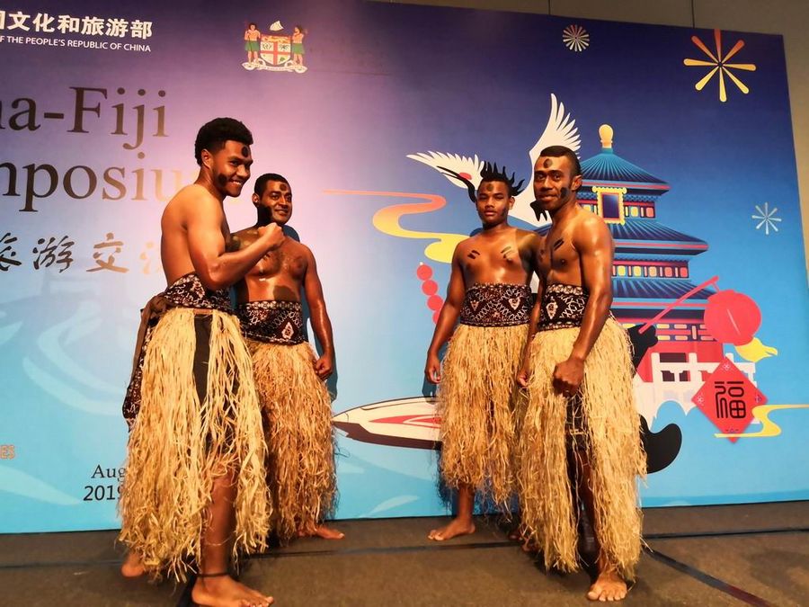 Fiji dancer give traditional performance at the opening ceremony of China-Fiji tourism symposium in Nadi, Fiji on Aug. 23, 2019. (Xinhua/Zhang Yongxing)