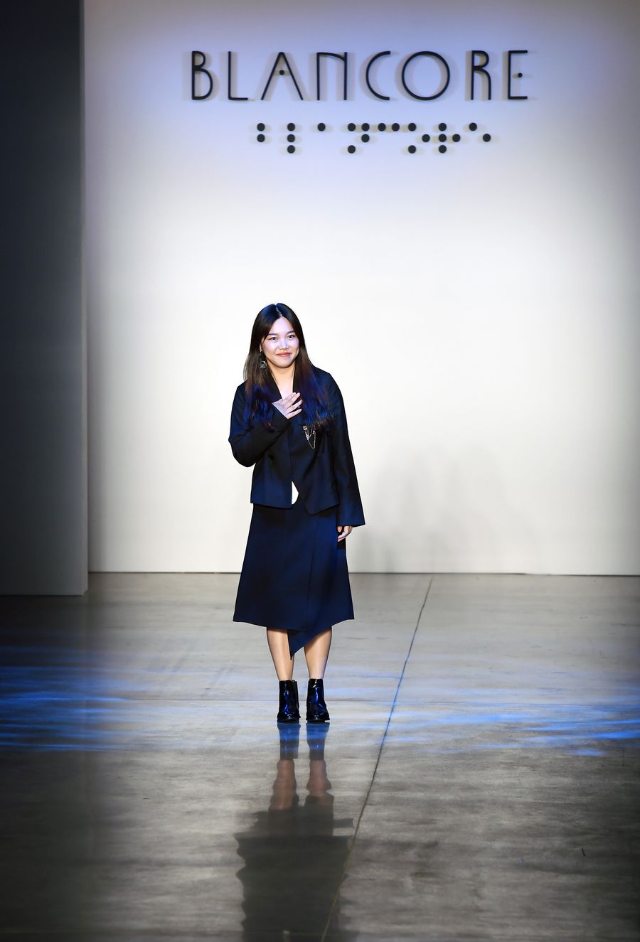 Li Yalan, founder and creative director of Blancore, greets the audience at the end of a fashion show of Blancore Spring/Summer 2020 collection during New York Fashion Week in New York, the United States, on Sept. 5, 2019. (Xinhua/Li Rui)