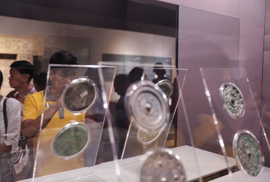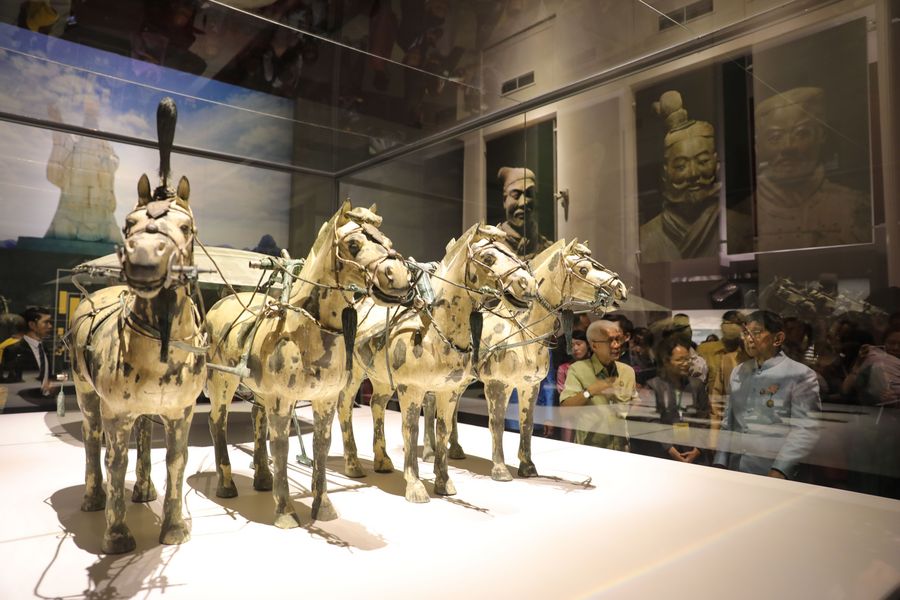 Visitors view exhibits during the exhibition "Qin Shi Huang, The First Emperor of China and Terracotta Warriors" at Bangkok National Museum in Bangkok, capital of Thailand, Sept. 15, 2019. (Xinhua/Zhang Keren)