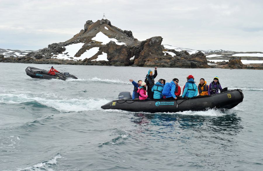 A rubber boat with Chinese tourists sails on the sea near the Great Wall station in Antarctica, Jan. 31, 2014. (Xinhua/Zhang Jiansong)