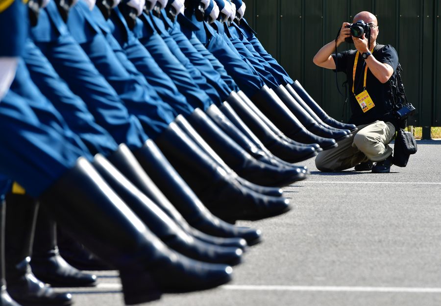 A journalist takes photos during a visit to the National Day military parade training site in Beijing. (Xinhua/Wei Peiquan)