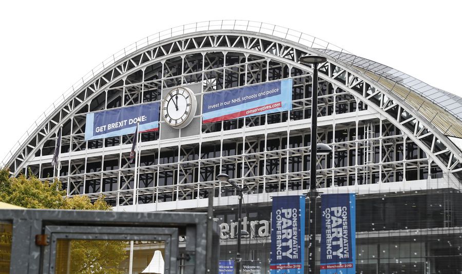 Photo taken on Sept. 29, 2019 shows the Manchester Central Convention Complex where the Conservative Party Conference 2019 takes place, in Manchester, Britain.(Xinhua/Han Yan)