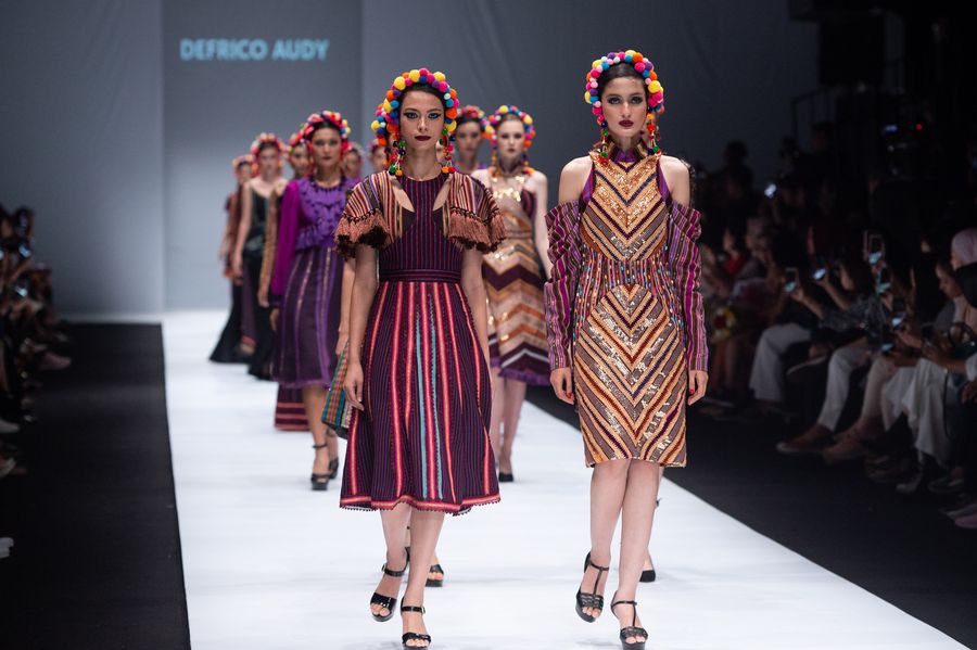 Models present creations by Defrico Audi during Jakarta Fashion Week in Jakarta, Indonesia, Oct. 22, 2019. (Photo by Veri Sanovri/Xinhua)