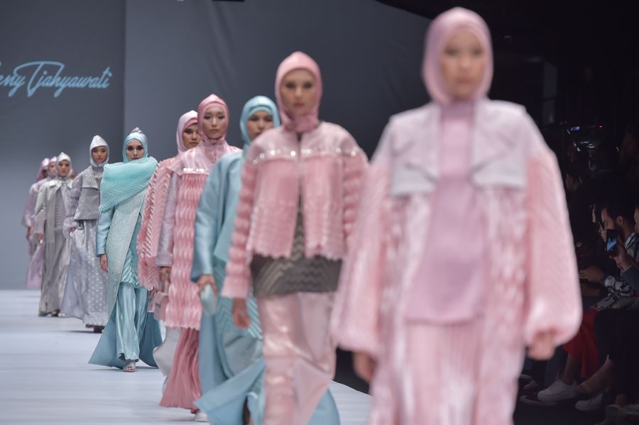 Models present creations by Jeny Tjahyawati during Jakarta Fashion Week 2020 in Jakarta, Indonesia, Oct. 22, 2019. (Xinhua/Veri Sanovri)