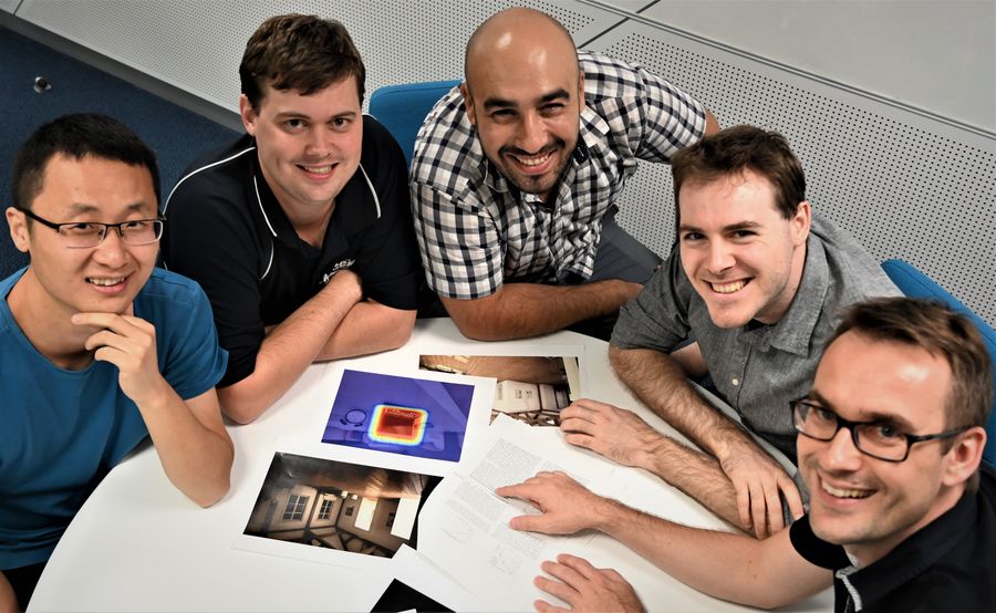 Photo shows center researchers behind the world-first Robotic Vision Challenge, including research fellow Haoyang Zhang(L1), research Fellow David Hall(L2), research Fellow Feras Dayoub(C), research Associate John Skinner(R2); and Chief Investigator Niko Sunderhauf(R1).(Provided by the Australian Center for Robotic Vision)