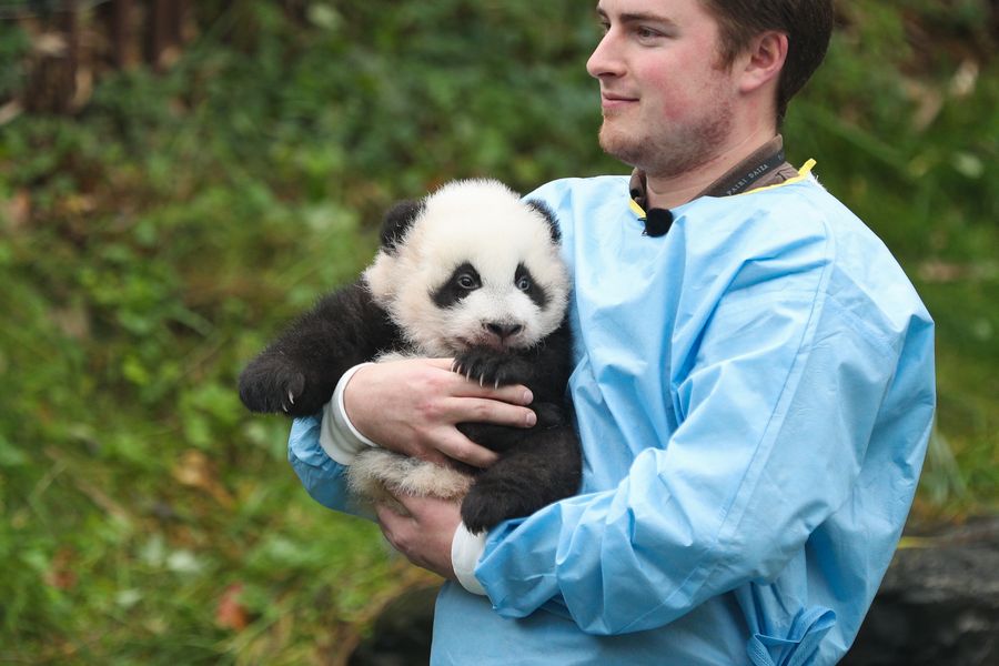A zookeeper holds the panda "Bao Di" at the Pairi Daiza zoo in Brugelette, Belgium, Nov. 14, 2019.(Xinhua/Zheng Huansong)