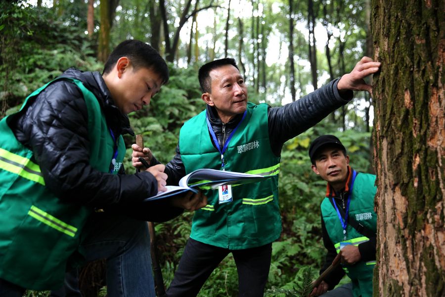 Foresters check trees on Cuiping Mountain in Yibin, southwest China's Sichuan Province. (File photo)