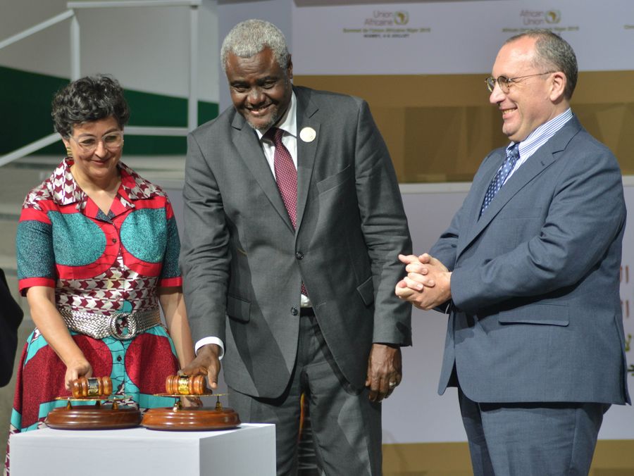 Chairperson of the African Union (AU) Commission Moussa Faki Mahamat (C) announces the operational phase of the African Continental Free Trade Area (AfCFTA) Agreement during the launching ceremony in Niamey, capital of Niger, July 7, 2019. (Str/Xinhua)