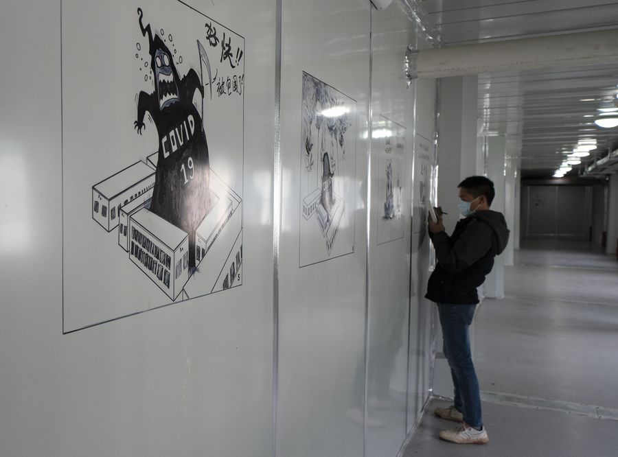 Xu Xinyan, a worker from China Construction Third Engineering Bureau Co., Ltd., draws on the wall of a corridor at the Leishenshan (Thunder God Mountain) Hospital in Wuhan, central China's Hubei Province, March 4, 2020. (Xinhua/Fei Maohua)