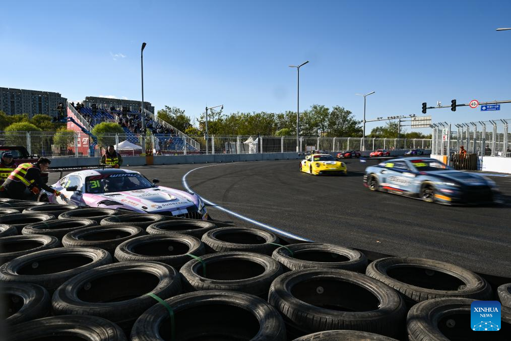Drivers compete during the Race 1 of GT World Challenge Asia at the Beijing Street Circuit in Beijing Economic-Technological Development Area (E-Town) of Beijing, China, Oct. 19, 2025. (Xinhua/Xia Yifang)
