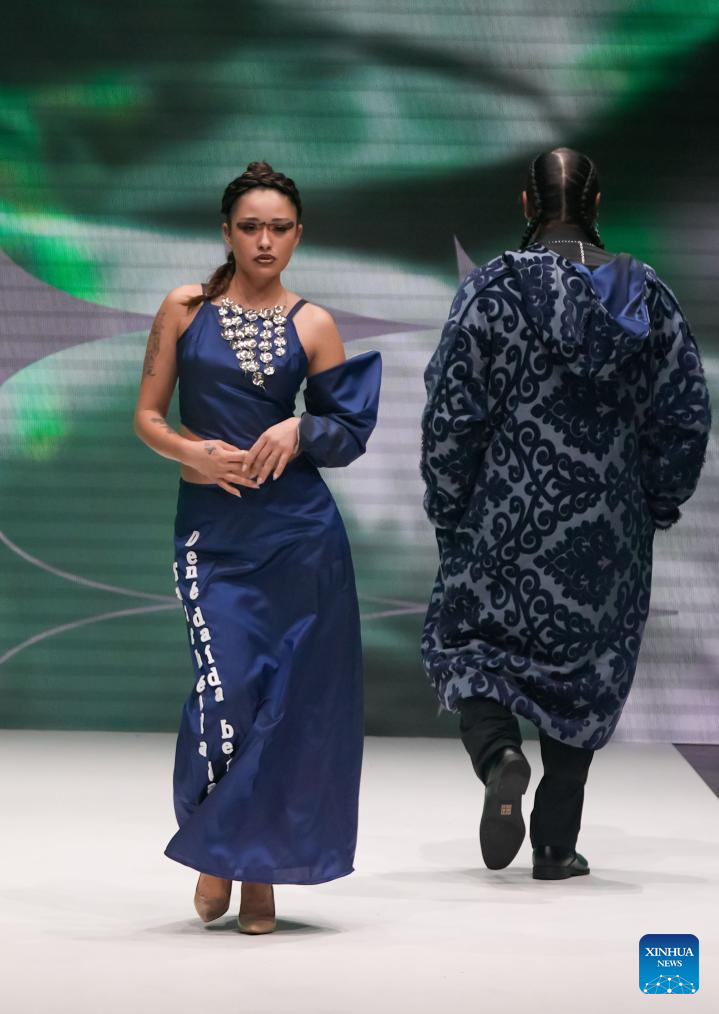 A model presents a creation by Tishna Marlowe x Jennifer Younger during the closing night of Vancouver Indigenous Fashion Week 2025 in Vancouver, British Columbia, Canada, Nov. 22, 2025.