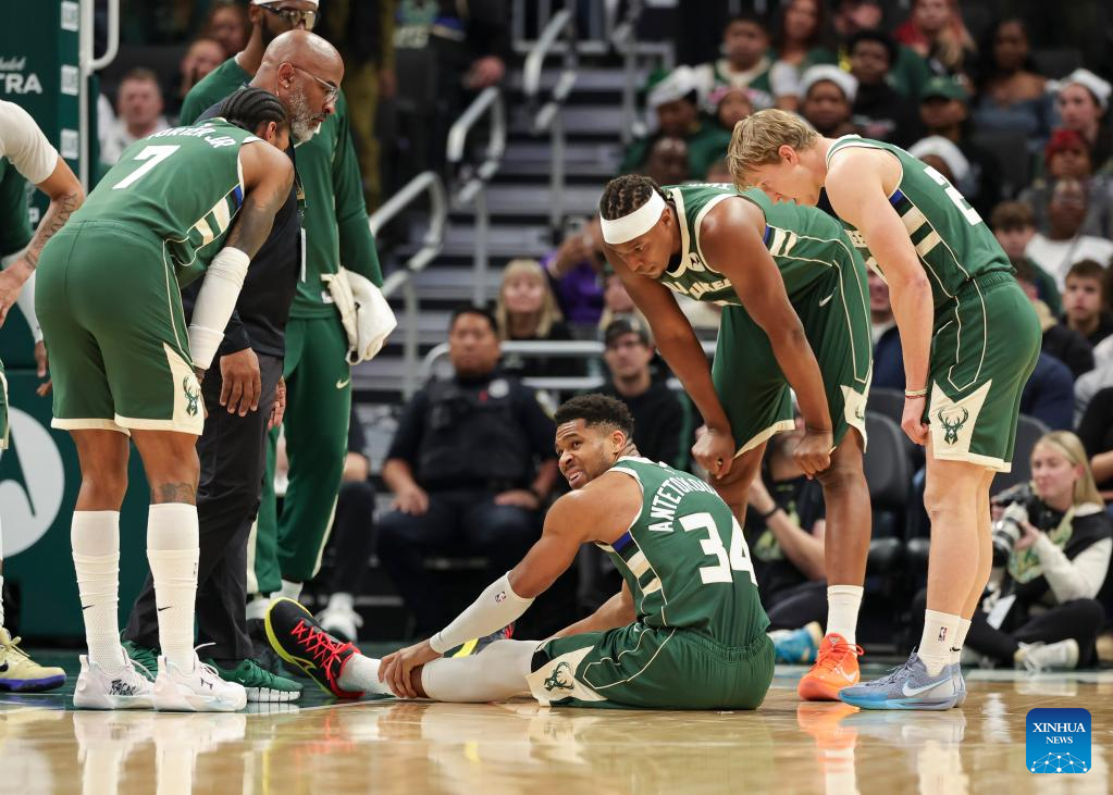 Thanasis Antetokounmpo (C) of Milwaukee Bucks sits on the ground after getting injured during the 2025-2026 NBA regular season game between Milwaukee Bucks and Detroit Pistons in Milwaukee, the United States, on Dec. 3, 2025. (Photo by Joel Lerner/Xinhua)