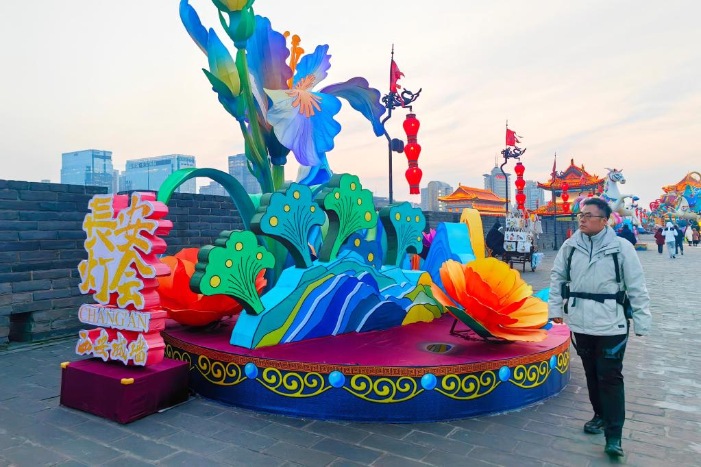 Zhao Bin walks on the Xi'an City Wall with an exoskeleton robot during the New Year holiday in Xi'an, northwest China's Shaanxi Province, Jan. 4, 2026. (Xinhua)