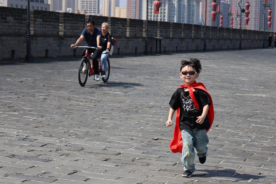A boy runs on the Xi'an City Wall in Xi'an, northwest China's Shaanxi Province, Sept. 12, 2025. (Xinhua/Zhu Weixi)