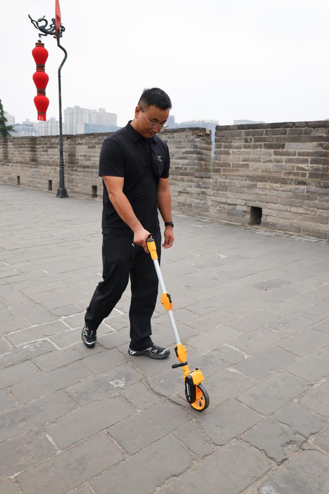 An inspector measures the length of a crack on Xi'an City Wall in Xi'an, northwest China's Shaanxi Province, Sept. 10, 2025. (Xinhua/Zhu Weixi)
