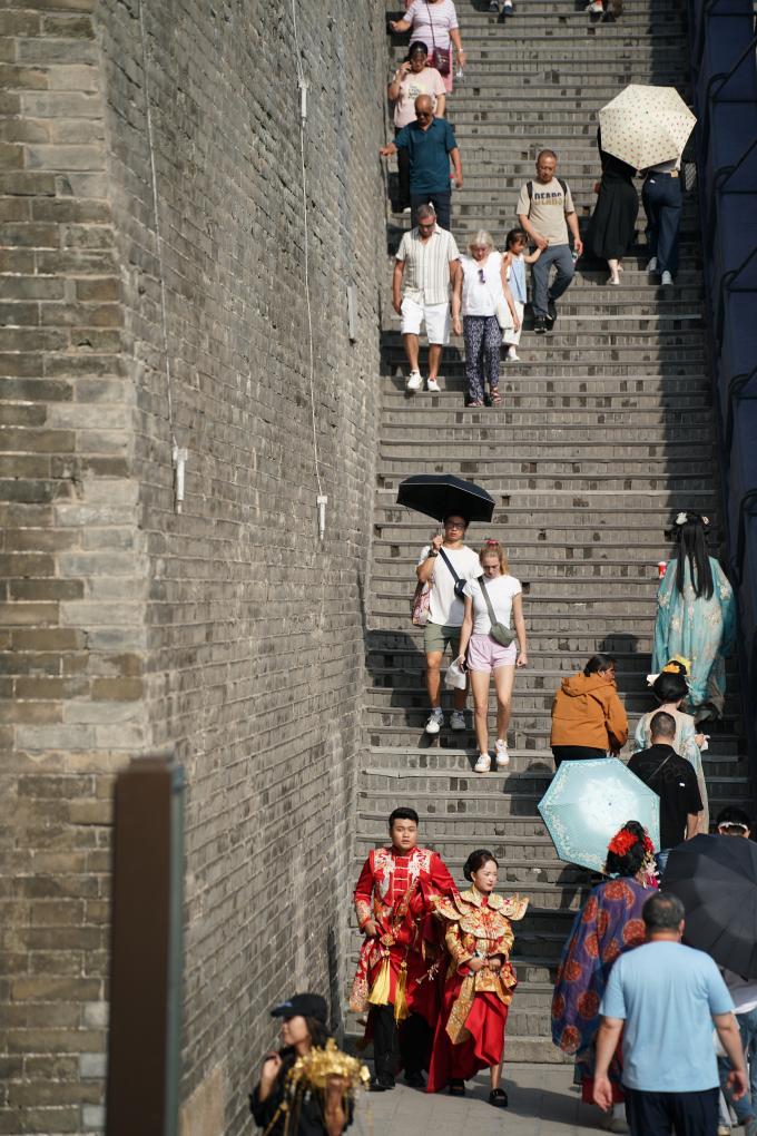 Tourists visit the Xi'an City Wall in Xi'an, northwest China's Shaanxi Province, Sept. 10, 2025. (Xinhua/Shao Rui)