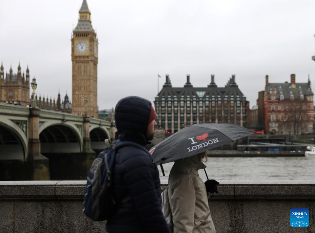 People walk with umbrellas near the Big Ben in London, Britain, Jan. 27, 2026, as Storm Chandra brings rain to much of the country. (Xinhua/Li Ying)