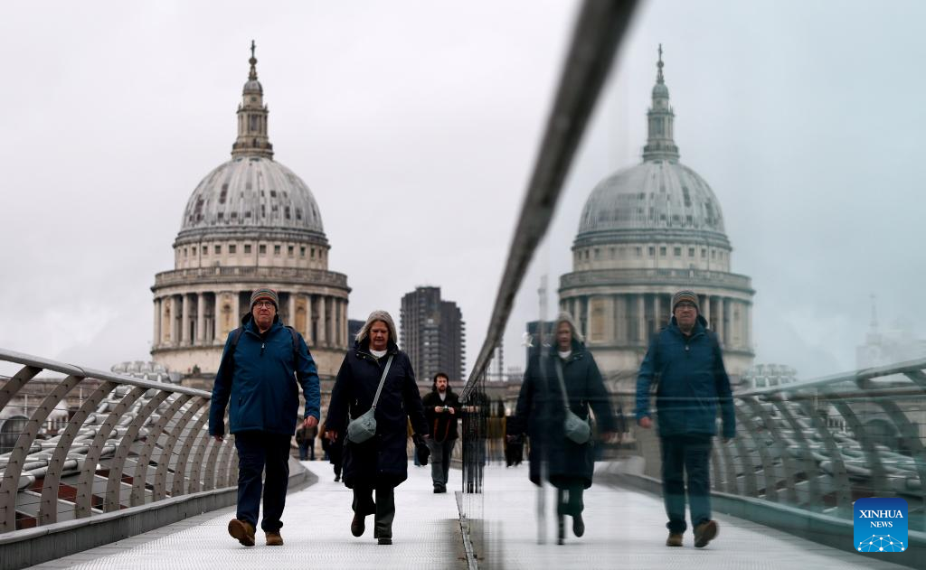 People walk on the Millennium Bridge in London, Britain, Jan. 27, 2026, as Storm Chandra hits the country. (Xinhua/Li Ying)