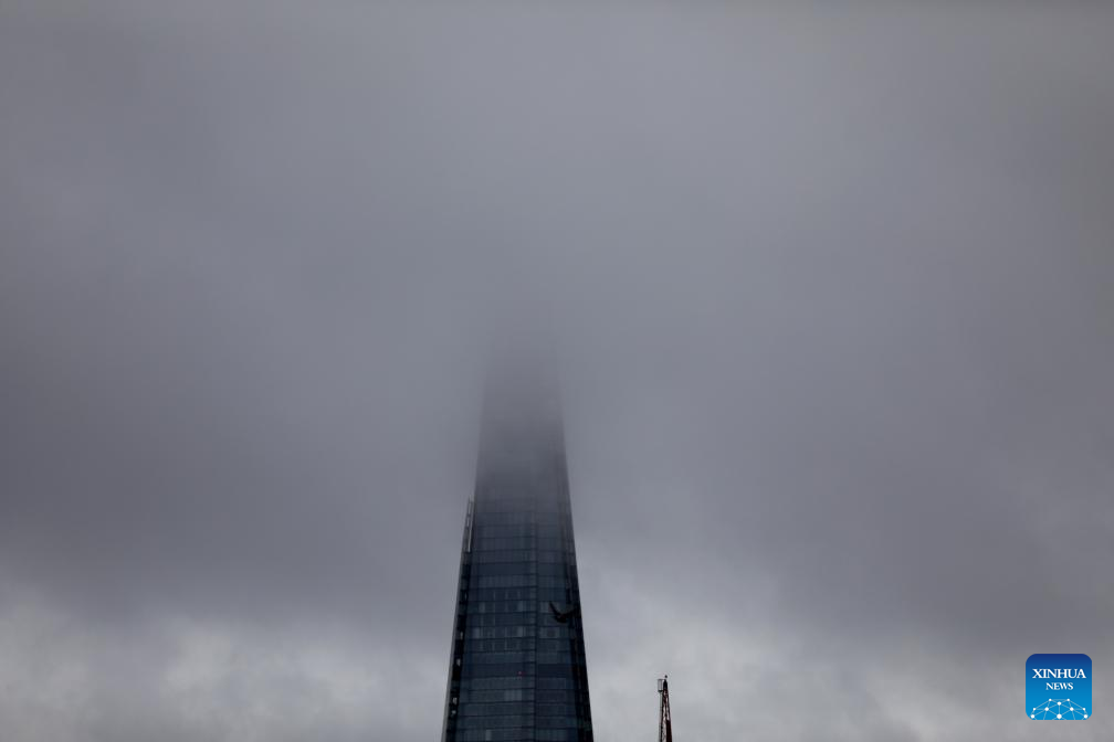 The top floors of The Shard skyscraper are pictured surrounded by cloud in London, Britain, Jan. 27, 2026, as Storm Chandra hits the country. (Xinhua/Li Ying)