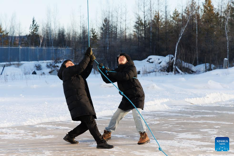 Assistant Engineer Tian Dong plays a game in which splashed water turns into ice in extremely cold air at the Mohe Station of the China Remote Sensing Satellite Ground Station in Mohe, northeast China's Heilongjiang Province, on Jan. 25, 2026. (Xinhua/Jin Liwang)