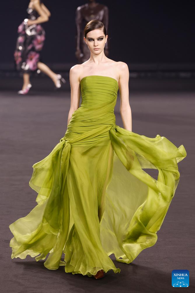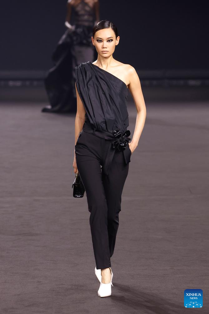 A model presents a creation from the ready-to-wear Fall/Winter 2026-2027 collections by Elie Saab during the Paris Fashion Week in Paris, France, March 7, 2026. (MeetEurope/Handout via Xinhua)