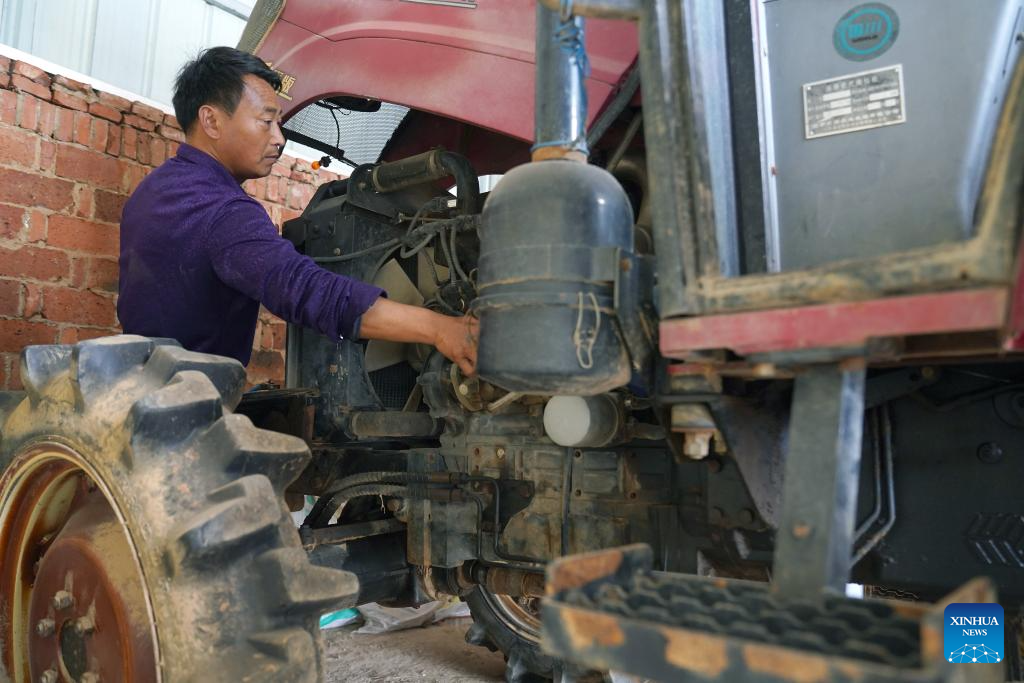 Jiang Liangqing checks the condition of agro-machinery ahead of spring farming in Yugan County, east China's Jiangxi Province, on Feb. 27, 2026. (Xinhua/Wan Xiang)