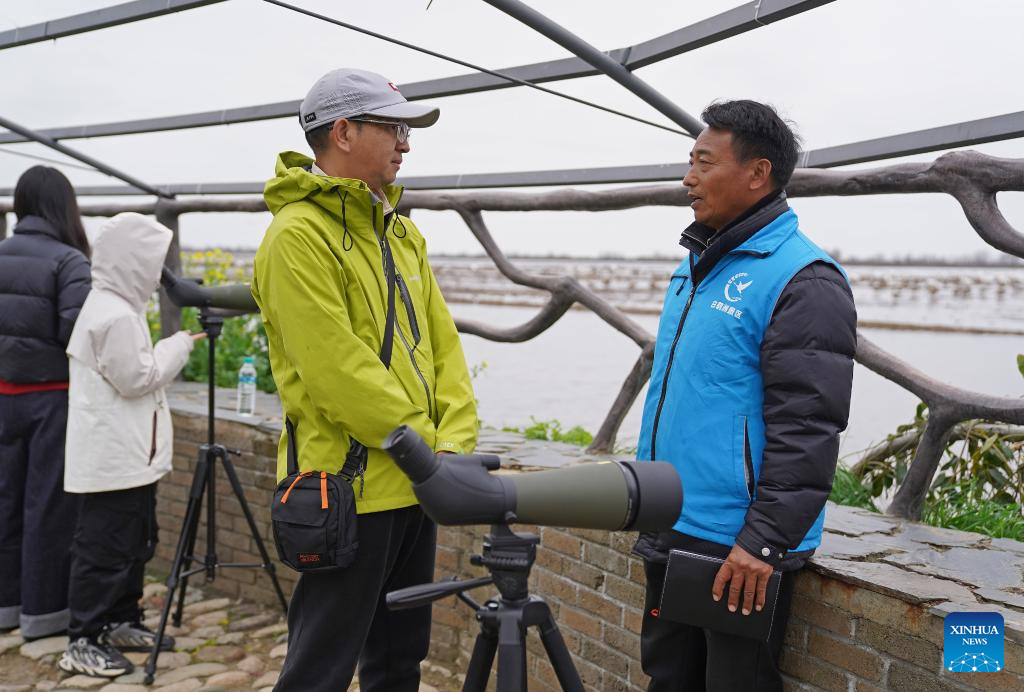 "Now I'm a bird guardian. I patrol the wetlands every day and share knowledge about bird conservation with tourists," Jiang said. Like him, many local villagers have joined conservation efforts, including raising ecological awareness and patrolling wetlands. (Xinhua/Wan Xiang)