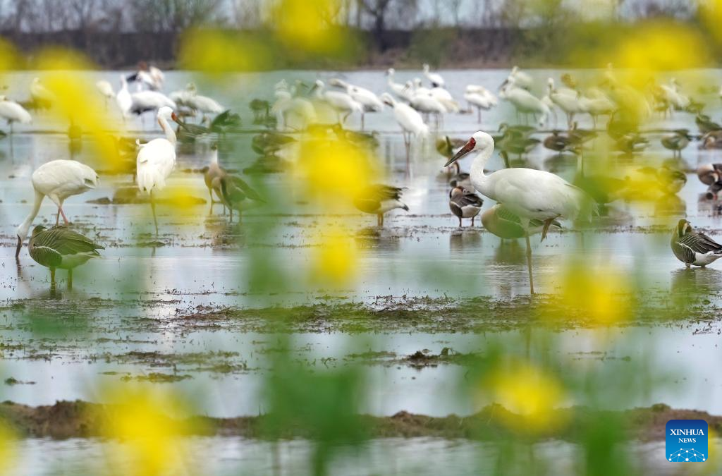 This photo taken on Feb. 27, 2026 shows migratory birds perching and foraging in Yugan County, east China's Jiangxi Province. (Xinhua/Wan Xiang)