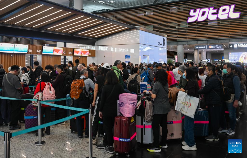 Taiwan compatriots stranded in the Middle East queue to check in at Istanbul Airport in Istanbul, Türkiye, March 9, 2026. (Xinhua/Liu Lei)