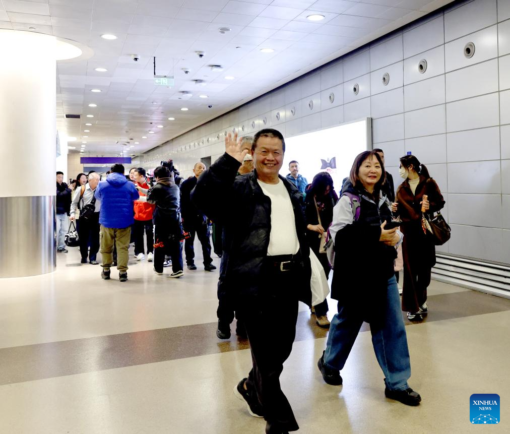 A Taiwan compatriot who was stranded in the Middle East waves while arriving at Shanghai Pudong International Airport in Shanghai, east China, March 10, 2026. (Xinhua/Fang Zhe)