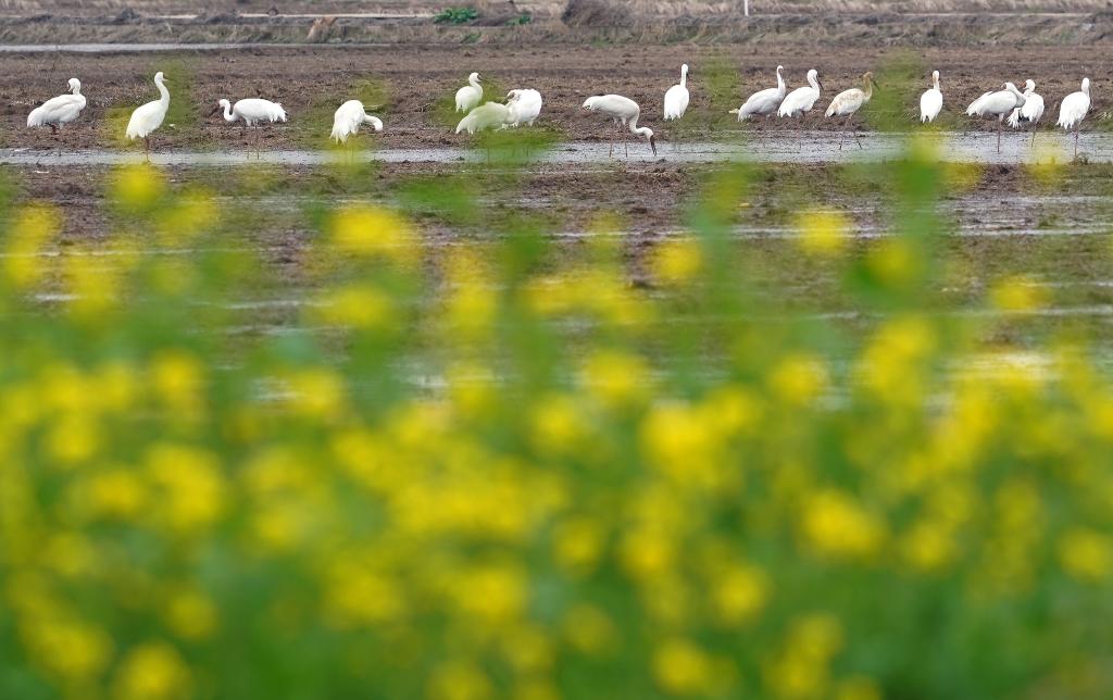 NANCHANG, March 11 (Xinhua) -- Poyang Lake, China's largest freshwater lake, sits in east China's Jiangxi Province. It is a vital wintering and stopover site along the East Asian-Australasian Flyway. Every winter, thousands of Siberian cranes, a critically endangered species, gather in Yugan County, which lies to the southeast of the lake.