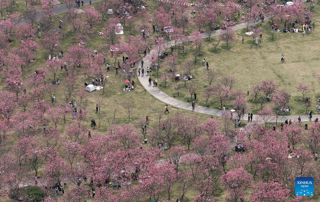 This aerial drone photo taken on March 14, 2026 shows people viewing flowers at a park in Wuhan, central China's Hubei Province. (Xinhua/Xiao Yijiu)