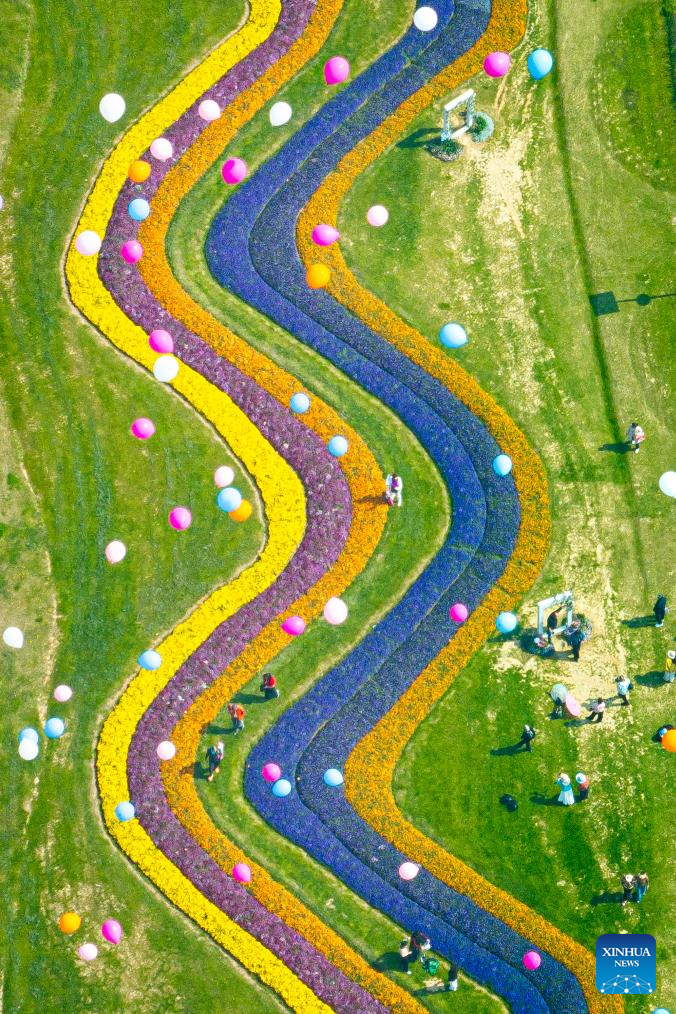 This aerial drone photo taken on March 14, 2026 shows people viewing flowers at Qingxiushan scenic area in Nanning, south China's Guangxi Zhuang Autonomous Region. (Xinhua/Zhou Hua)