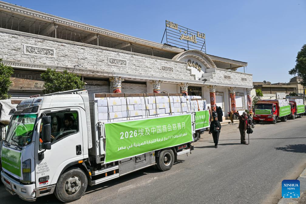 This photo taken on March 9, 2026 shows trucks loaded with boxes of donated items during a donation event in Giza, Egypt, March 9, 2026. The Chinese Chamber of Commerce in Egypt and the Egyptian Orman Association jointly held a donation event in Giza governorate on Monday to help Egyptian families in need.(Xinhua/Xin Mengchen)