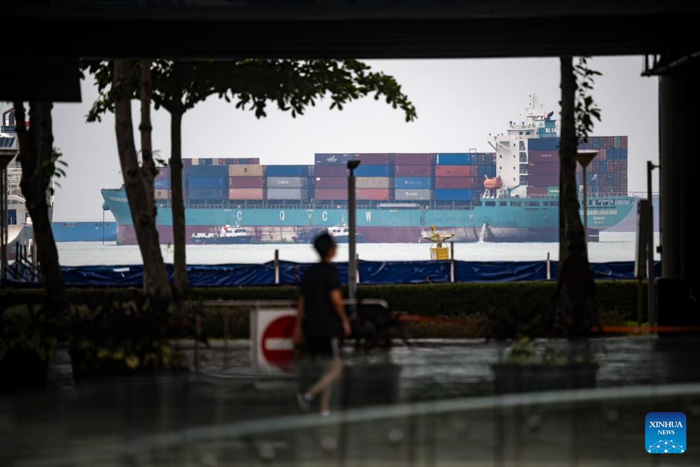 A cargo ship is seen berthing at the Singapore Straits on Oct. 17, 2025. Singapore's non-oil domestic exports (NODX) grew 6.9 percent year-on-year in September, reversing an 11.5 percent contraction in August, according to data released Friday by Enterprise Singapore. (Photo by Then Chih Wey/Xinhua)