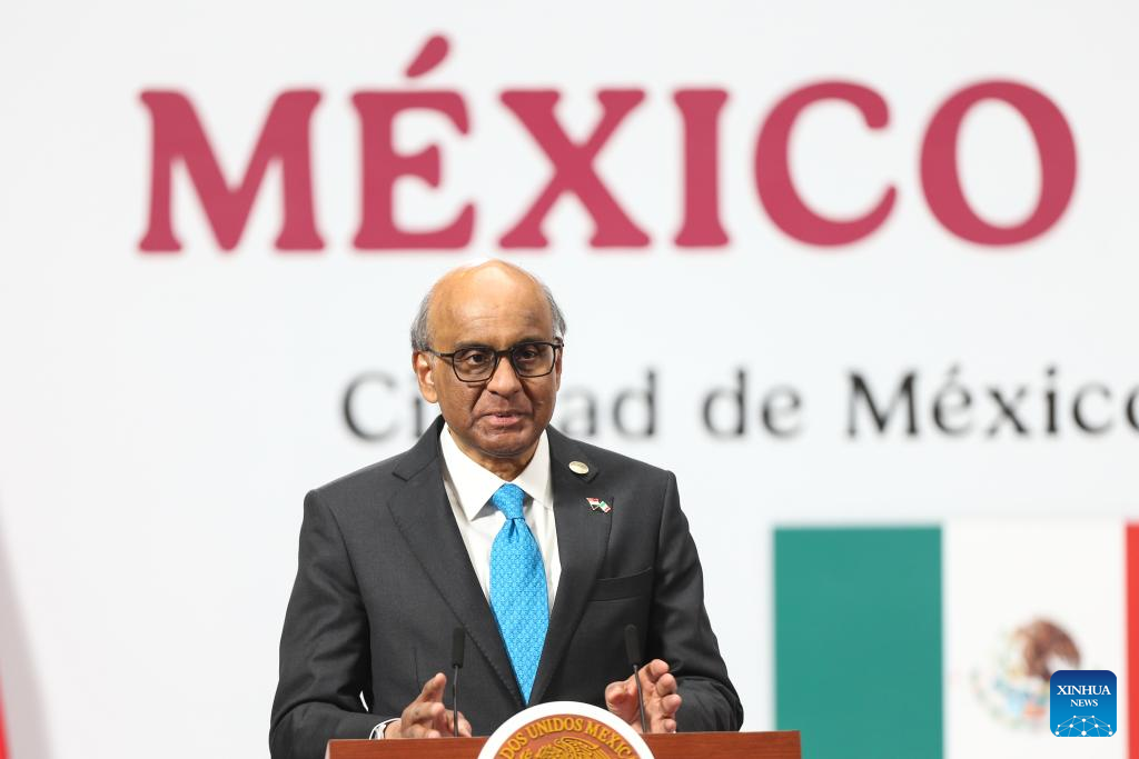 Visiting Singaporean President Tharman Shanmugaratnam speaks during a joint press conference with Mexican President Claudia Sheinbaum at the National Palace in Mexico City, Mexico, Dec. 1, 2025. (Photo by Francisco Canedo/Xinhua)
